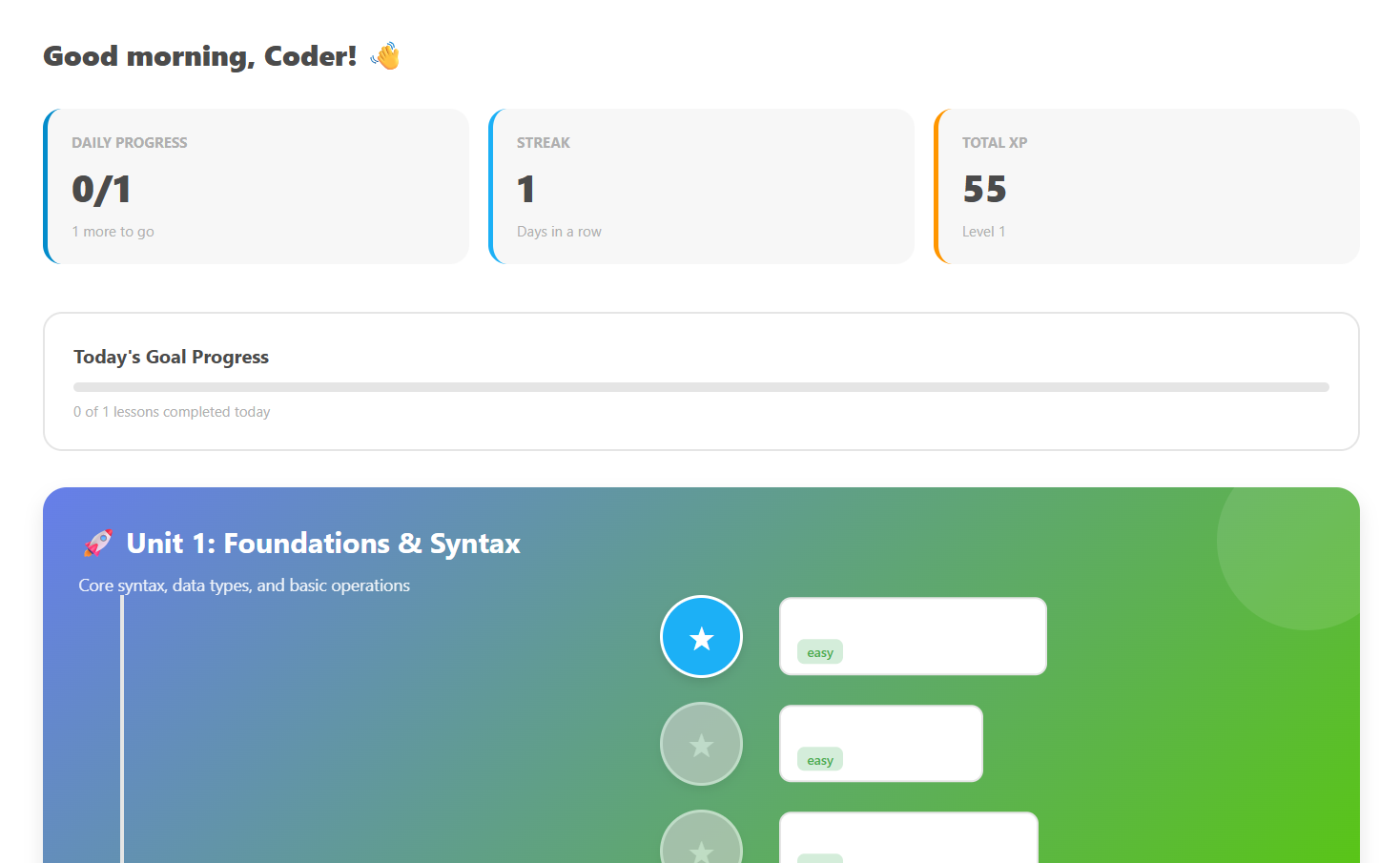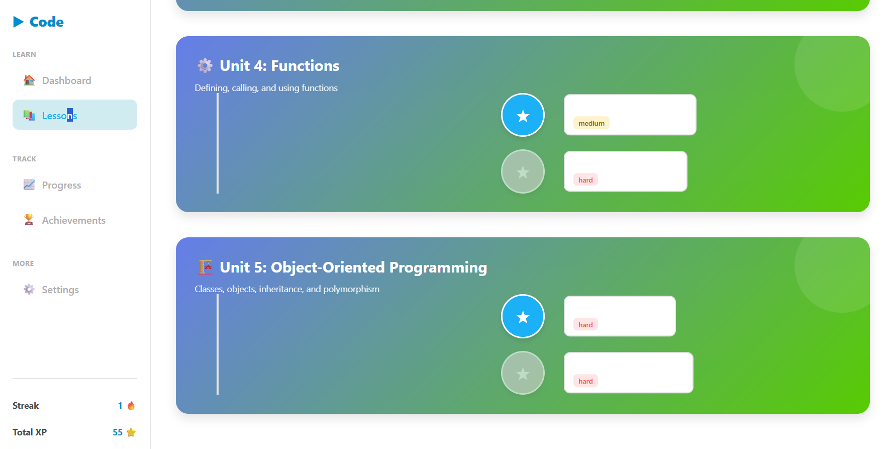 Each language includes step-by-step tutorials, hands-on coding challenges, and projects designed to reinforce what you learn. Track your progress, unlock new levels as you improve, and develop practical skills that can be applied to real software development, game creation, web applications, automation, and more.